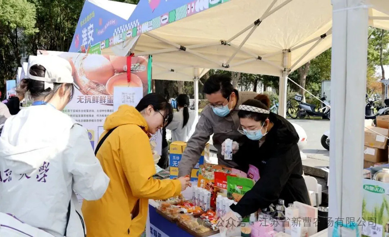 活动现场人气十足。新曹农场展台前,苏垦优品“玉谷鲜鲜蛋”与“新曹”牌玫瑰系列产品成为焦点。“玉谷鲜鲜蛋”、“玉谷”香卤蛋以细腻的口感、浓郁的蛋香赢得试吃师生一致好评,不少人关注直播间并下单;“新曹”牌玫瑰系列产品凭借天然花香,吸引众多师生驻足咨询,工作人员现场讲解玫瑰产品功效,并赠送试用小样,互动氛围热烈。此外,农场还带来简苏纯牛奶、苏米糍锅巴等多款苏垦优品,整齐摆放的展品全方位展现了苏垦农产品“品类丰富、品质过硬”的特色,满足师生多元化消费需求。